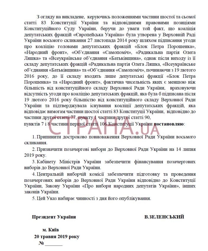 В распоряжении "Страны" появился проект указа новоизбранного президента Владимира Зеленского о досрочном роспуске Верховной Рады и назначении внеочередных выборов Конституция Украины, который он планирует подписать после инаугурации 20 мая.
