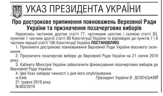 "Руководствуясь частью 2 статьи 77, частями 6 и 7 статьи 83, пунктом 1 части 2 статьи 90 Конституции Украины и в соответствии с пунктами 7 и 8 части 1 статьи 106 Конституции Украины постановляю: 1. прекратить досрочно полномочия Верховной Рады Украины восьмого созыва. 2. Назначить внеочередные выборы в Верховную Раду Украины на 21 июля 2019 года", – сказано в указе №303/2019 от 21 мая. Зеленский также поручил Кабинету министров обеспечить финансирование внеочередных парламентских выборов.