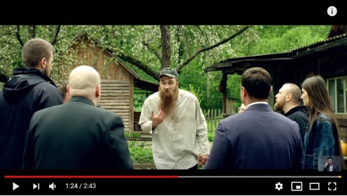 На этот раз в мини-кино показан сюжет из села, где люди донимают претензиями победившего на неких выборах бородатого чиновника, который теперь отмежевался от их проблем. В итоге его окружают и "прижимают к стенке".